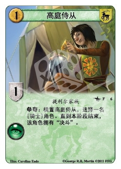 功能说明 争夺:横置高庭侍从,选择一名[骑士]角色。直到本阶段结束,该角色拥有“决斗”。