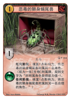 :横置1点影响力,将恶毒的狮身蝎尾兽附属到一名角色。(视为一张[生物]附属牌,规则文字为“所附属角色获得能力值-1。