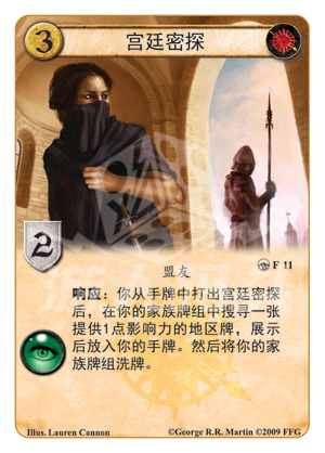 :你从手牌中打出宫廷密探后,在你的家族牌组中搜寻一张提供1点影响力的地区牌,展示后放入你的手牌,然后将你的家族牌组洗牌。