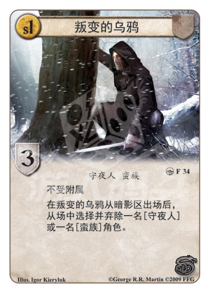 在叛变的乌鸦从暗影区出场后,从场中选择并弃除一名[守夜人]或一名[蛮族]角色。
