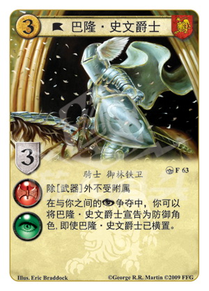 在与你之间的阴谋争夺争夺中,你可以将巴隆·史文爵士宣告为防御角色,即使巴隆·史文爵士已横置。