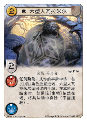 功能说明 任何阶段:从你的手牌中将一名[生物]角色放置进场,六型人瓦拉米尔返回你的手牌。在本阶段结束时,如果该[生物]依然在场,将其从场中弃除(不能援救)。