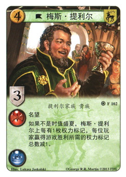如果不是时值盛夏,梅斯·提利尔上每有1权力标记,每位玩家赢得游戏胜利所需的权力标记总数减1。