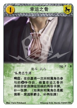 响应:在你赢得一次所附属角色参与的权力争夺争夺后,横置幸运之骨并弃除你家族牌组顶端的两张卡牌,补一张牌。(如果所附属角色是戴佛斯·席渥斯爵士,补两张牌)