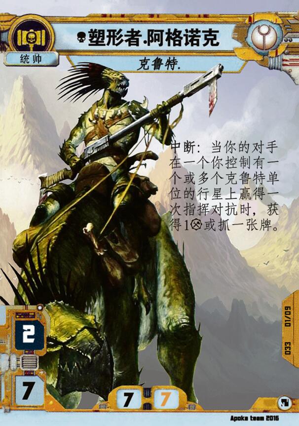 :当你的对手在一个你控制有一个或多个克鲁特单位的行星上赢得一次指挥对抗时,获得1资源或抓一张牌。